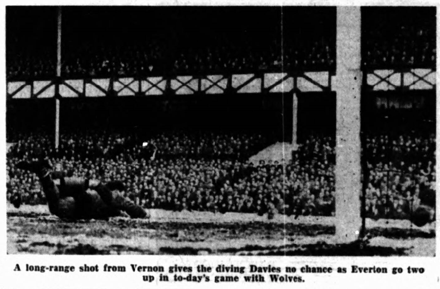 Both Everton wing halves were moving up well to help the attack. Everton were awarded a free kick as Kirkham fouled Vernon a yard outside the box and Vernon slipped the ball to Collins, standing unmarked, and his fine shot was well saved by Davies—just about the busiest man on the field. From a beautiful pass from Vernon. Bingham moved inside neatly and tried a left foot shot, but it went straight at the Wolves goalkeeper. Everton were playing some of their best football for weeks. Passes from Gabriel and Harris had hardly been an inch out so far, and with Vernon in his best form. Everton always looked more likely to score than Wolves, whose play, generally, was ragged.