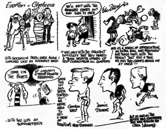 With Vernon almost entirely subdued, it was hard to see where the spark to set Everton aflame would come, Temple promised to provide it from time to time and the way in which he dealt with Armfield was a most encouraging sight. Near misses there were in profusion, just to keep the pot boiling, but while it was early to despair of ever seeing a goal, that was the way it was beginning to look. Nobody gave a second thought to danger when Parker, off balance conceded a corner kick, for nothing short of a penalty, looked at all likely to open the score. Yet surprisingly, the corner kicked provided it. Parry's kick outdistanced the goal and found the pint=sized Hill swooping on it. Back he sent the ball and Petersen met it on the turn to give West no sort of chance. Whether it was the goal or the roar of the crowd that helped to galvanise Everton into attack hardly matters, but in 56 minutes they were level. Vernon, covering a lot of ground. But being permitted no latitude at all, made this equaliser without touching the ball. It was temple who sent in an innocuous looking shot, which would have threatened no-one, had Vernon not charged after it like a bull at a gate. On and in he went so that Harvey, playing in only his fourth game for Blackpool, could hardly help noticing the advancing figure and calculating that he would receive man and ball together. He had time merely to push the ball out before Vernon arrived, and straight to Young it went, for the centre forward to accept the scoring chance readily.
