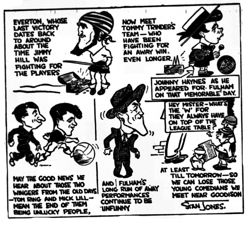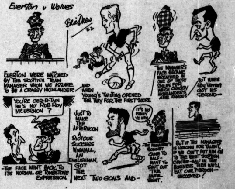 The players, I know reject out of hand any idea that they put more effort into their work in their home ground, but their record is too consistently poor to lay the blame at the feet of misfortune all the time. The knowledge that sooner or later inability to give satisfaction must lead to some replacements should surely be the spur to tap any reserves of endeavour there may be, but still the sorry story continues. The visit of Wolves recalls that it was against this club that Everton scored their last victory away from Goodison –as long ago as October 14. Facing the fact that the season can offer nothing to Everton now in the way of honours they can still prevent their programme winding up in a wave of apathy, but only by serving up performances worthy of their name. It is no good pointing to one particular player and attributing the entire and position to his, loss of form, for if we face up boldly to the truth, how can we stand the admission that in the forward line at least the failure is widespread. If adequate reserve power were available and unfortunately that boast is denied us, how many of the present line could confidently claim that their position was secure? That the forwards can rise to the heights we know, for have they not done so against some of the best opposition? Let us hope that the challenge of Stan Cullis men will be the signal for the reawakening. Undoubtedly the loss of George Thomson has been felt in defence, but when all allowance has been made it is the forward line which stands convicted of the major responsibility for the Everton decline. Everton; West; Parker, Green; Gabriel, Labone, Harris; Bingham, Collins, Wignall, Vernon, Young. Wolves; Davies; Stuart, Thomson; Kirkham, Slater, Flowers, Wharton; Crowe, Murray, Durandi, McParland.