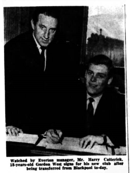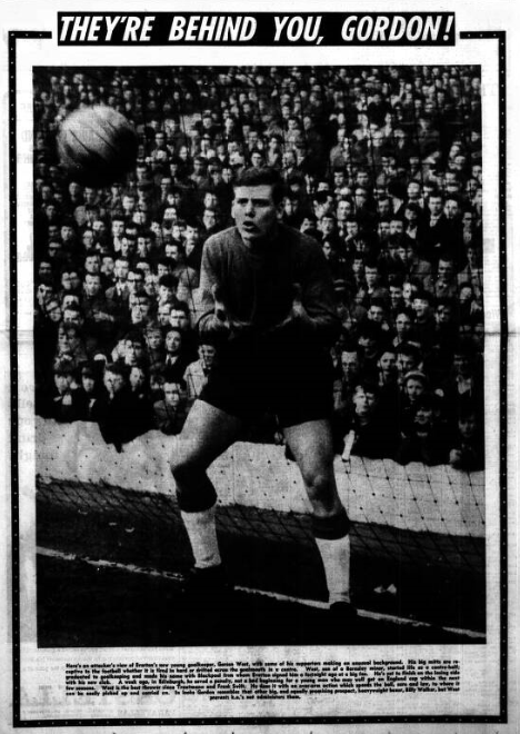 Everton F.C. to-day signed from Blackpool, England under-23 goalkeeper, Gordon West, who is not yet 19 years of age. He plays to-morrow against Wolves, displacing Liverpool - born Albert Dunlop whose long run in the first team dates from the days when Cliff Bittton was manager at Goodison Part. The fee paid Everton was not disclosed, but as Blackpool had said that they would not take less than £25,000, it must have been one of the biggest ever paid for a goalkeeper. West, who was born in Barnsley and played for that club before he joined Blackpool, knew notting of Everton's k interest in him until last evening when Everton Manager Harry Catterick made a quick visit to confer with Blackpool manager, Ronnie Suart. Negotiations progressed so well it was possible for West to come to Goodison Park at mid-day to-day. He had earlier trained with the Blackpool team at Bloomfield Road.