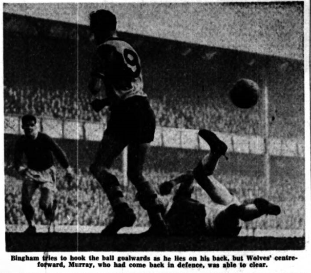 West made a great save from Murray but his work was in vain as a Wolves forward was offside. West soon showed the power of his throws, a couple of which were a bit too speedy for the Everton players. McParland spent most of his time in the middle and all Wolves' corner kicks on the left were taken by Durandt to give the Irishman a chance to show his heading ability. Everton had the Wolves' defence in a real tangle with one attack which saw Vernon pull the ball back to Harris, whose shot was blocked. The ball ran out to Bingham,and his shot was diverted only inches outside the post by Thomson.