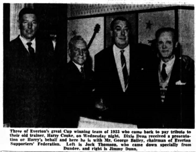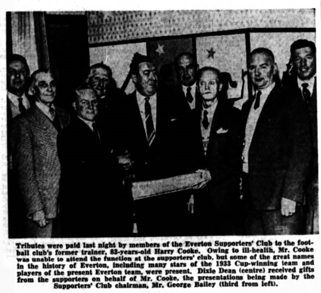 I told you a few weeks ago that the show the Everton Supporters' Federation planned to put on for Harry Cooke would be something to remember, and it certainly was. The big night was last Wednesday, and there were Everton players of four eras present. Unfortunately Harry was taken ill shortly before the show and could not be present, but many of the pre-war players called round to his house to wish him well. To try to capture some of the atmosphere of a great night here are just a few of the past stars who were there... Jimmy Dunn, Jock Thomson (he came all the way from Dundee), TedSagar, Charlie Gee, and Dixie Dean. Then there were letters read out from Torry Gillick,Sam Chedgzoy and Cliff Britton, Peter Farrell and Cyril Lello represented the immediate post-war side, and among the ex-Everton players now with other clubs were plat' Woods, Harry Leyland, Jimmy Hams, John Parker, and Tony McNamara. Even Liverpool were represented in the person of Bert Slater. And., of course most of the present Goodison side were there. Two of our present backroom boys, Gordon Watson and Frank Blundell, had a great time meeting old friends and chatting about great matcher of the past.