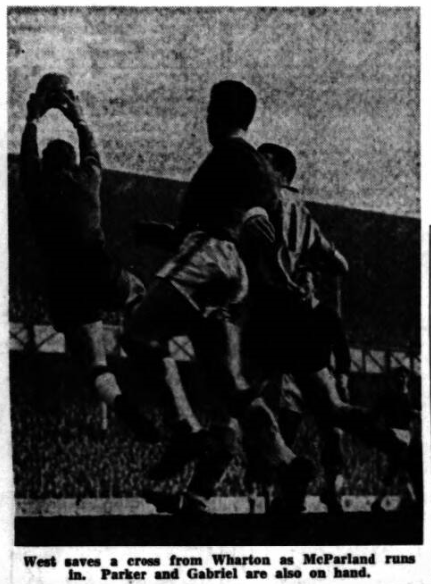 He has played in the same England Under-23 side as Brian Labone and in the England Youth eleven with George Sharpies. West, whose fiancée is a Blackpool girl, started football as a centre half. He might have made another Ron Yeats, but one day he went between the sticks and found he liked it better there, than in the outfield. From that moment he progressed splendidly. Wolves, with McParland and Crowe fitting in well are back to their old form. They have had a lean spell, but these two judicious signings have done them as much good as the signings by Liverpool of St. John and Yeats.