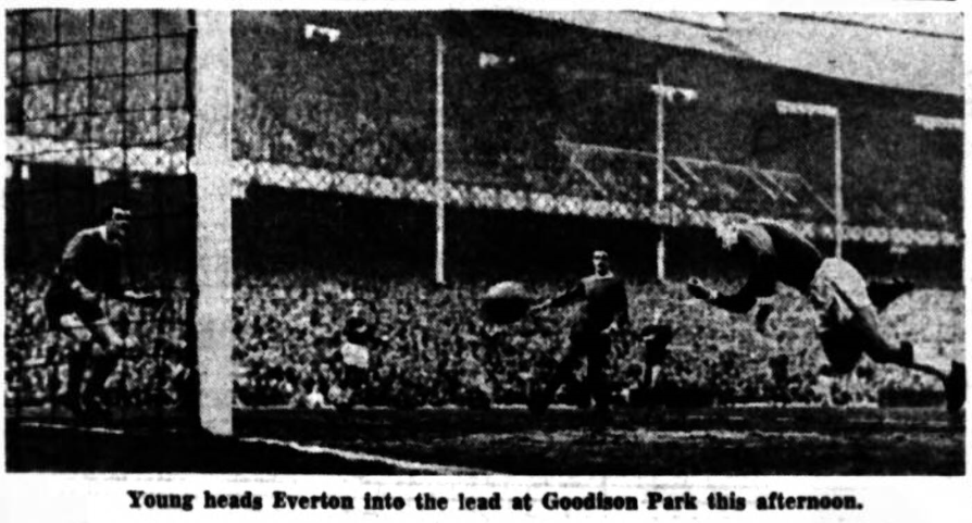 For a boy of 18 years, West is immensely big and strong. He has thighs like Dicky Downs, that other Barnsley tyke who figured in many Everton defences. Everton appear to have got a good buy, and, better, a good boy. But because these were Wolves whose fangs were never bared—one even doubted they existed!—West was never given opportunity to show what he could do against powerful, accurate shooting. The match was virtually won and lost in the first 23 minutes. It was almost a formality from that point because no side three goals down so early has much chance of rehabilitating itself. Vernon went close to scoring what must have been the quickest Everton hat-trick since the days of Dixie Dean. He had two in the apace of two minutes, and only a desperate, full-stretch save by the Liverpool boy, Davies, swept the ball round the post when he threatened to snatch a third. And what great goals they were! If Vernon's dynamic shooting can win a match in the space of a couple of minutes it is true, too, that Young's dynamic approach play can do similarly for anyone who cares to accept the chances he "tees up" for them. In the first case Young slipped the ball through the legs of a defender; beat another in a clinch for possession, and then when most outside lefts would have looped the ball into the goalmouth, edged it sharply with the outside of his foot to where Vernon stood poised to make his strike. It was a magnificent shot, but not more magnificent than the approach by Young which led to it. Two minutes later Vernon scored from a headed pass by Wignall. At 23 minutes Wignall headed a goal from another centre by Young. Three minutes from time he scored again to prove that even if he appears slow in thought and action he is usually effective in the air near goal.