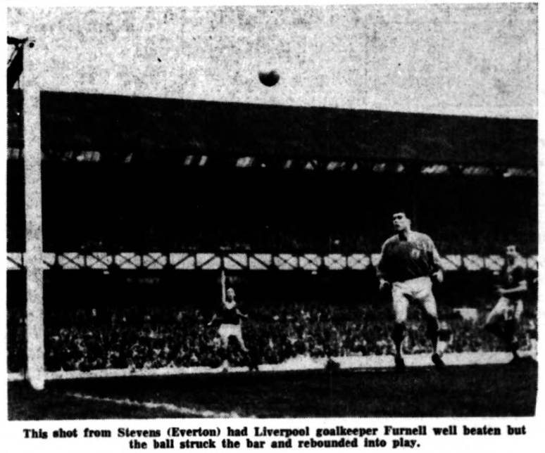 Stevens for example had the most cruel ill-luck when the cleverly flicked the ball over the head of the advancing Furnell, and then saw it hit the post and come out. With only ten minutes to go there came one of the narrowest escapes by either side. Young sent Temple away, and he crossed the ball accurately in front of goal to Stevens who directed his hot beautifully just inside and to the foot of the post. Down went Furnell with a reaction that did him the greatest credit and he made the sort of save which proved conclusively that good as he is in the air, ground shots hold no terrors for him, big man though he is, I counted this among the most thrilling incidents in the whole game. Another debating point came when the match was only four minutes old. Bingham threatened to burst clean through down the middle. As he approached the penalty area, in went Byrne and down went Bingham. Penalty or not? The referee against but it was a very close thing. Thrills abounded in these opening stages and Liverpool’s principal worry was centred around the battle between Yeats and the stand-in centre forward Webber. The youngster showed a disconcerting turn of speed so fan as the Scot was concerned and he was rushed into making several errors. Possibly because we have grown to consider Yeats immune from the sort of thing, his difficulties were the more surprising. For example, it was completely foreign to Yeats that he should miss a through ball from Young as he did and in went Webber, with a wonderful opportunity. Here again fabulous Furnell had the situation weighted up in a trice. Out he came to charge down the shot from the shortest of short range and Liverpool breathed again. The opening promised a “derby” of genuine class, even though it was Everton who were making the running, and Liverpool marshalled their resource coolly and only occasionally was there any sign of panic. Liverpool weathered the storm, and it was a completely different story after the interval, for Liverpool undoubtedly took over the ascendancy and they looked most dangerous when they brought their wings into play. A’Court often made ground most promisingly against Meagan and though Callagham struggled with Thomson, still this was the type of play that was required to lift the standard. As time went on Milne, Yeats and Leishman took such a stranglehold on Young, Webber and Stevens that Everton almost came to a full stop. St. John could never quite gain the mastery of Labone except in the air, when he succeeded consistently and in Gabriel, Melia found a virile defender, terribly difficult to beat. It was Gabriel, who not only did his defensive work, but struggled to put some pep into a flagging attack. I thought West distinctly fortunate in 70 minutes to get in the way of a grand Callagham strive, deflected possibly en route. Maybe it was the manner in which Milne so completely mastered a Young, who earlier had threatened to be troublesome, that caused the almost criminal neglect of Temple, the player who more than anybody else in the Everton team looked able to pull the match out of the fire. After St. John had almost paid tribute to an A’Court cross by flicking narrowly wide, Everton’s dying effort came from Young. His best shot of the match, low and fast moving, swung right across goal and wide. This was sufficient in release the Liverpool victory chant “When the saints go marching in” obviously a tribute not only to St. John, but to the whole team, for it is not every day Everton lose at Goodison. This may not have been the best “derby” in the series, but we have seen many less exciting games during the season, momentous though it has been. Everton; West; Meagan, Thomson; Gabriel, Labone, Harris; Bingham, Stevens, Webber, Young, Temple. Liverpool; Furnell; Byrne, Morgan; Milne, Yeats, Leishman; Gallagham, Lewis, St. John, Melia, A’Court. Referee; Mr. RV Stringer (Liverpool). Attendance 46, 600