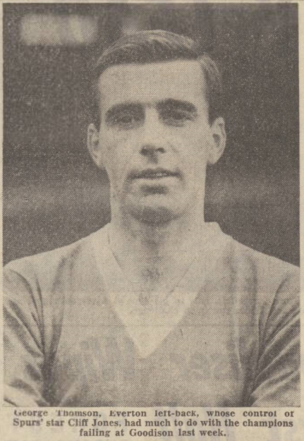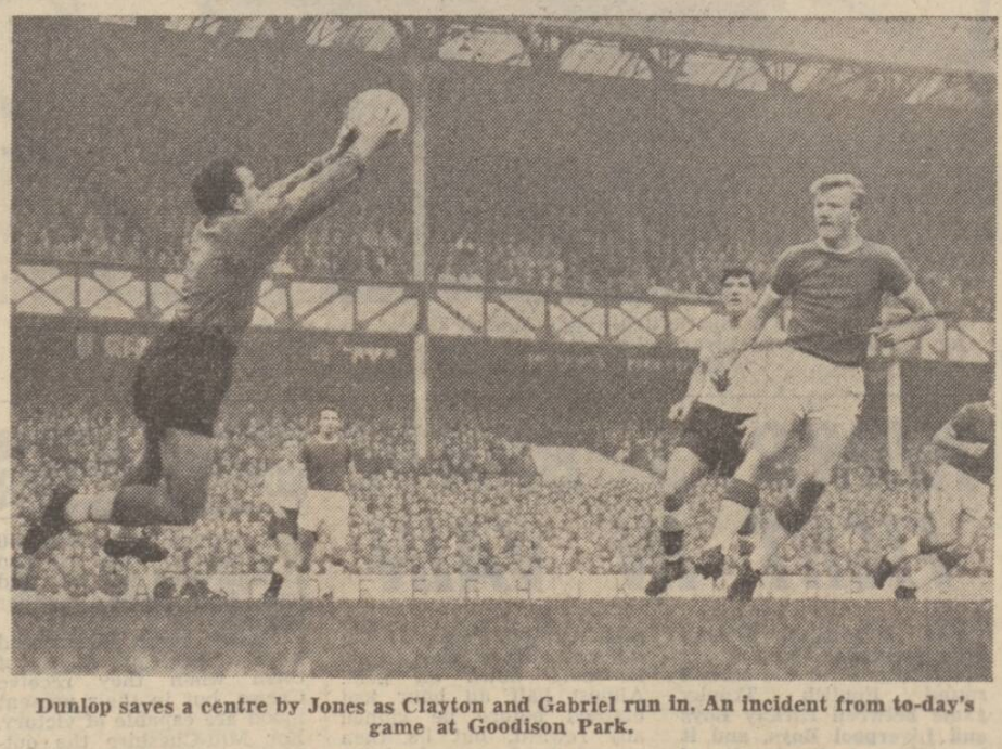 Tottenham, just ahead of the feet of Everton in the League table, centre had Mackay at left half in place of Marchi. Mackay had a bandage on his left elbow. Everton had a let-off in the opening minutes when a long throw from Mackay beat the home defence on the bounce and also eluded Jones, who must have had a simple chance had he been quick enough to take it. Spurs had started with great skill and pace and an intricate passing move among the forwards saw White deliver a cracking shot from 20 yards which Dunlop saved superbly at full stretch. Dunlop was in action again a moment later when Jones beat Thomson and took the ball 30 yards before delivering a dangerous centre which Dunlop cut off almost from the head of Saul.