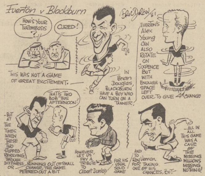 At this stage last season Tottenham were already showing signs of running away with the championship, which deservedly dropped into their lap, for they had a clear lead of four points and boasted an away record of eight wins from as many games. Now they are three points inferior to Burnley, a point and a game better off than Everton, in third place, but that away record has lost much of its impressiveness with nine points dropped out of fourteen. For all that, this will be a match every bit as difficult for Everton as was that against Sheffield Wednesday, with the important difference that we hardly expect another Everton display like that. It took a London club (Chelsea) to put the first draw in Everton’s record since last April and it may be that another London club will keep the draw sequence going today. Everton; Dunlop; Parker, Thomson; Gabriel, Labone, Harris; Bingham, Young, Wignall, Vernon, Fell. Tottenham Hotspur; Hollowbread; Baker, Henry; Blanchflower, Norman, Mackay (or Marchi) Jones, White, Saul, Clayton, Dyson.