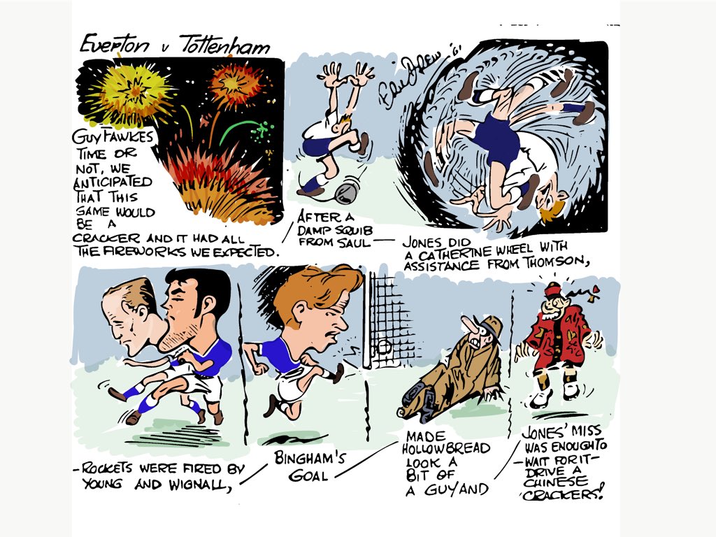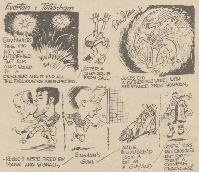Remember, remember the fourth of November the day on which Everton served notice on the mighty Spurs that they are ready, willing and able to take over the mantle of greatness gathered about them by the Londoners last season. This was not only Everton at their best, but it was Everton in their bravest, most spirited mood, so much so that the loss of an effective Parker for most of the game hardly caused them to reduce their stride. That the feat was achieved also without Bobbie Collins, the acknowledged master mind of the side was even greater reason why the elated Evertonians should start weaving fanciful dreams of accomplishment and greatness. I never expected to see the mighty Spurs capitulate so utterly and completely to a ten-man team and yet the plain, unvarnished truth is that the greatly heralded half-back line simply disintegrated before the persistent and progressive Everton attack. If you had not known who was wearing the No 4 jersey, I doubt very much indeed if you would have taken the trouble to discover it was Blanchflower and while Mackay struggled to give the line some measure of majesty, I think his spirit broke when he was the last in a chain of defensive errors that helped Wignall to smash home that first goal in forty-two minutes.