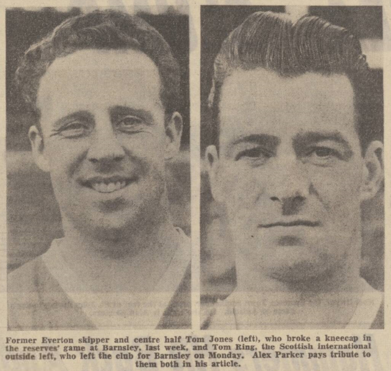 It was a coincidence that Tommy Ring, another of our serious injury victims, should be transferred this week to Barnsley. I know everybody at the club was sorry to see Tommy go, for he was a very popular character at the club. He has been particularly unlucky in his stay at Everton. Many critics believed he was finished when he left Clyde for Goodison nearly two years ago, but he didn't take long to prove them wrong. In his very first match with us, on a heavy pitch, he was the star of a 6-1 win over Nottingham Forest. I have particular reason to remember that game for I also scored, and it was a very happy bunch of footballers who trooped off Goodison that day. Mr. Carey, who was manager at the time, asked Bobby Collins and I, as fellow Scots, to make Tommy feel at home, but we didn't have to do that for long. He very soon settled into the Everton routine and proceeded to play some real “blinders." It was a tragedy when he broke a leg after being with us only a few months and I am sure everybody will wish him well, and a change of luck, with his new club.