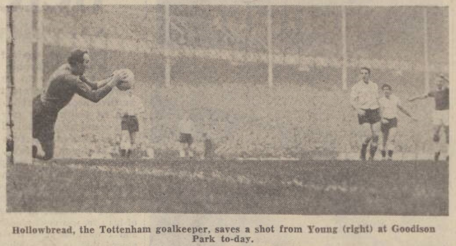 It was soon obvious that Parker could make little effective contribution, so that in effect Everton were playing with ten men. Everton were playing with a great deal of fire despite their handicap, although Spurs cultured football was lovely to watch. Little Dyson was booed for some minutes by the crowd after he had fouled Young, but Mr. Taylor continued to have expert control. Bingham scored the most remarkable goal after 54 minutes to increase Everton’s lead. It was a triumph for his endeavour in chasing what appeared to be a lost cause. Fell pushed the ball through to him to the left of the goal and Bingham, in evading the out coming Hollowbread pushed the ball right to the by-line but contrived in some miraculous way to turn the ball over the line from the most acute angle possible. Bingham landed head first among the photographers and was the only man on the field not to see his remarkable shot count. The game was hotting up in every direction and Thomson was guilty of a most blatant body check on Jones as the winger went flying through. Three minutes later Everton went three up. Fell pushed the ball over to the right for Young to collect and Young made such an accurate centre close to the goal line that Hollowbread, no doubt disconcerted by the attentions of Wignall, allowed the ball to pass behind him into the net. It seemed at though Wignall had headed the ball, but from the manner in which the Everton players rushed to congratulate Young it was apparent that the ball had gone direct into goal.