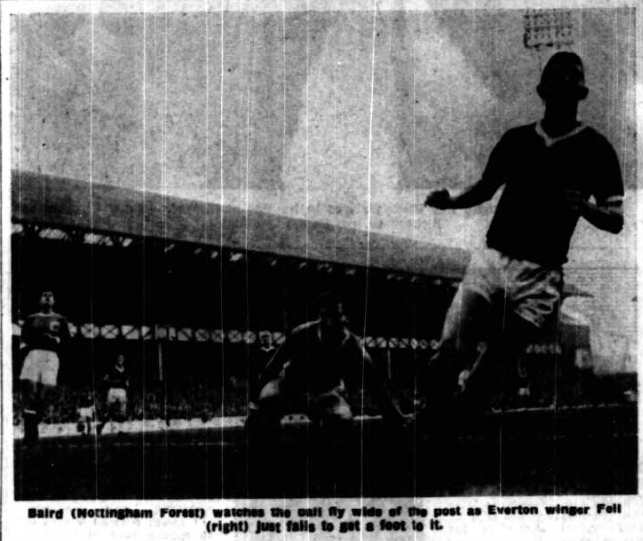 Although Everton were taking time to settle down, they looked the more dangerous side and a lovely feint by Vernon almost got him clean away, but be was crowded out at the edge of the penalty area when about to shoot. Fell was the next to beat the Forest defence, slipping neatly between Baird and Whitefoot, but his cross was blocked by McKinlay, and when Harris got the ball across Bingham was Off- side.