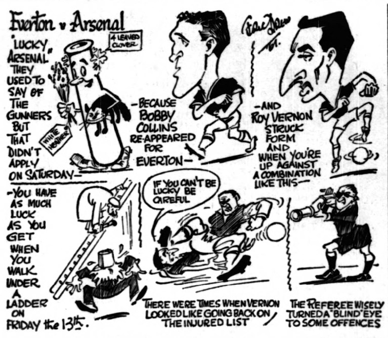 Just two names on a team sheet, but what a world of difference they made to Everton. The return of Collins and Vernon acted like magic and transformed the while of their attack. If Everton were to claim that this Collins, Young, Vernon triangle is as good a club, inside forward formation as any in the country, they might find a lot of people willing to go all the way with them-so long, of course, as they do not mention it too near Anfield. Young, as I had hoped, showed his appreciation of the changed formation with a display that plainly promises a rapid return to the standard of excellence with which he thrilled spectators last season. Before the game I was surprised at the number of people who expressed regret that Wignall had been left out. This obviously is a mark of the undoubted progress he has made, but for me Young, good and getting better, is just the man to place between master footballers of the type of Collins and Vernon. These three, in almost complete harmony, led Arsenal such a merry dance that one saw more fouls from the Londoners than should ever be the case. I think Arsenal realized just how unsporting was some of their play, but the realization that to allow these phantoms in blue to go skipping past could only lead to disaster, imposed a temptation which they were powerless to resist. For the most part it was sheer delight to sit back and watch some of the Everton football, and it was no accident that Collins, Vernon and Young were the men figuring most prominently in it. One expected something out of the ordinary every time they touched the ball and generally there was no let down. With Bingham also celebrating his inclusion in this august assembly with a most workmanlike effort it is hardly surprising Everton scored four times. It might have been much oftener, for first Vernon missed a treble when his lofted header passed inches over the bar with Kelsey well out of the picture, and then flashed the ball a foot wide, Parker and Bingham congratulated themselves on the part they had played in the “score.” Bingham hit the underside of the bar without registering. Still I think victory by 4-1 is convincing enough. Fell was a great deal more effective than at Burnley, but it seemed to be a struggle for him to try to keep pace with the football that came apparently so naturally from his colleagues. Too, often he slowed down movements when team mates were running into the open spaces in readiness for the quick thought and equally rapid action. To some extent Brian Harris fell into similar criticism, for there were times when he failed to perform what seemed to be this obvious part in a movement and contrasted with precision placing from others the comparison was the more glaring. For all that who could point a finger of criticism at him defensively? I thought his tackling like that of Gabriel was magnificent and there is a lot to be said for a man so much on top of his defence.