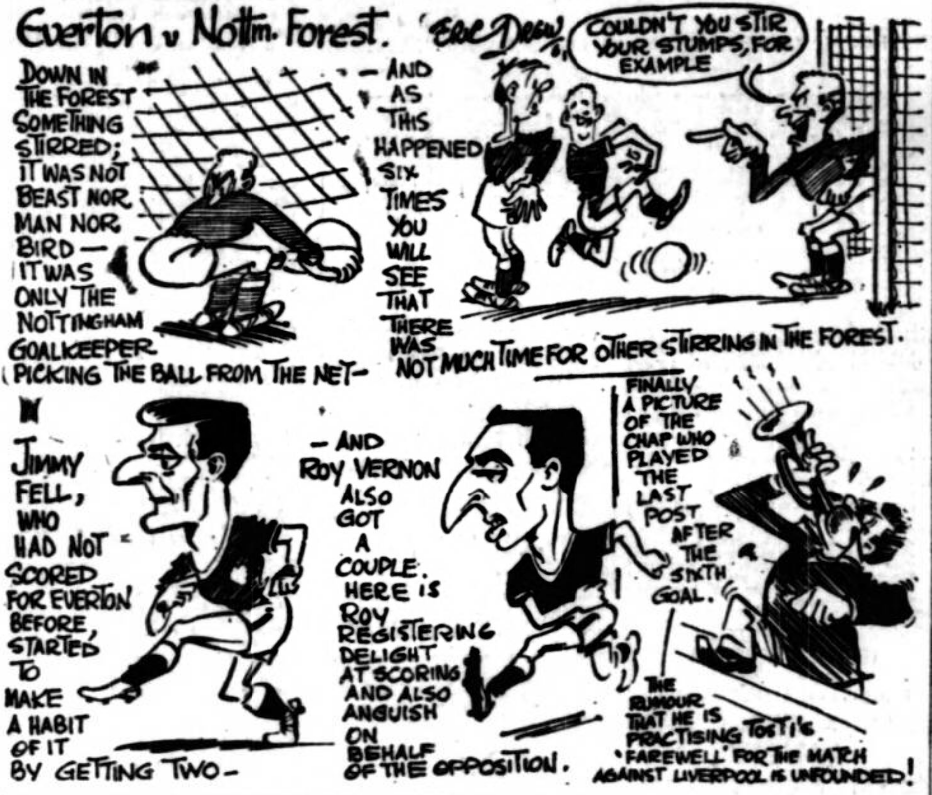 While it must be said that Forest’s defence, apart from the half-back line, was not the sort of offer a real testing, one cannot escape the position that the Everton forwards operated in a manner which justified their six goals and more. Most of the credit, goes to Young for his cool, calculating destruction of the Forest defence, but this was a match which entities anyone to say that not one Everton player had an off day. This applies to Dunlop as well, for he made three magnificent saves, none of which was equaled by Grummitt but one cannot help wondering whether the necessity for them would have been the same if Everton had not been leading so handsomely. Forest had many good things to show in middle, but there was never any penetration at the vital moment and only Addison and perhaps Quigley, had anything to offer in attack. Inevitably then their best players were in defence, with Grummitt, McKinlay and Iley taking the honours. Poor Iley never outlived his first half act of catching the ball high above his head to stop Collins going clean through and for much of the match he was the recipient of boos from the crowd. A little unfortunate in this I thought because if he was tough in his tackling at times there was reciprocal action from certain Everton players. Most Everton spectators believed that once Collins and Vernon were at again the side would recover. There is a lot of evidence for that contention, in spite of the fact that Collins was nothing like as dominant as he can be. It could be that another move has done Everton a power of good, the recall of Brian Harris to left half. Harris had a splendid match and his strength is what is needed in such an import position. He and Gabriel clamped down on the Forest inside men to such a point that they themselves provided the illustration of Everton’s superiority by both being offside together in one second half incident. But whether it is forward or t half back that Everton have found the means of recapturing their ability and confidence hardly matters. What does matter is that the side can hammer in six goals so effortlessly and so brilliantly. It was fourteen minutes before Everton led and it came because Forest bungled their offside trap. They prepared to trap the forwards when Thomson took over a partially cleared free kick so that when the full back chipped the ball forward and Vernon nodded it down there was Gabriel steaming through to score unchallenged. Young took the major role in the other goals. In thirty-three minutes he dribbled down the left and put over a perfect cross to Vernon, who breasted it down and shot low into the corner of the net.
