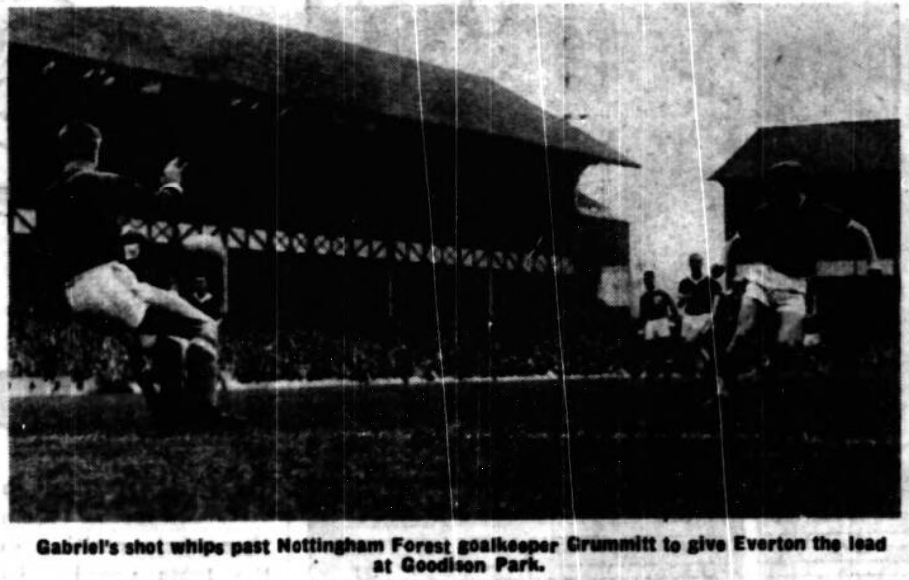 The match was lukewarm at present, with Forest mainly on defence, but keeping Everton out of shooting range. Forest in attack could not get going at all. A beautiful pass by Vernon to Collins, racing forward into an open space, was intercepted, goalkeeper style, by Iley. But for this blatant handling offence Collins must have had a wonderful chance. But from the free kick Everton took the lead after 14 minutes. Vernon's kick was blocked and ran out to Thomson who chipped it forward for Collins to head sideways and Gabriel, running through, steered it cleverly past Grummitt for his second goal in successive matches. Forest, by their actions, musthave thought Gabriel was offside, but it was his speed to the ball which made it appear so. Everton were moving with a good deal more zip and fire now. And Gabriel moved forward again to try a shot from, 20 yards, which Grant intercepted near the foot of the post.
