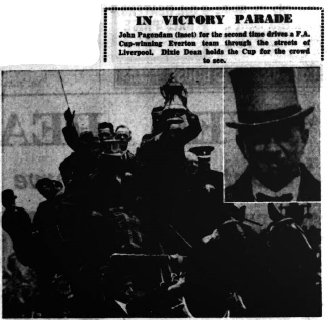 A man who has spent 70 years of his life driving horse-cabs, four - in - hands and taxis round Liverpool has just retired. John Pagendam, who lives at 40 Bailey Drive, Orrell, Bootle, is now 84 and he reckons he has earned the right to take things easily. He had the distinction on two occasions, 27 years apart, of driving victorious Everton football team in triumph through the streets of Liverpool after they had returned home with the F.A. Cup. "If they win it again this season, someone else will have to drive 'em," says old John. John Pagendam, with his long whip and his fat cigar, became almost a legendary figure in Liverpool streets. He had started straight from school in his own horse-cab business . " I paid 20 pounds an enormous sum in those days - to buy my first mare, and she stayed with me for 15 years." he told me to-day. "My parents gave me the money, but the business was my own. “ It was work from daybreak to nightfall and often enough we had calls during the night in emergencies. But I was young, and so was the mare. We didn’t mind losing our night’s sleep now and then “His business prospered. He invested his savings in more horses and his stables saw the entry of his first wagonette, needing four horses to pull it when fully laden with passengers. "In 1906, before they went to the Crystal Palace to meet Newcastle in the Cup Final, the Everton club approached me and asked me to arrange to be at Lime Street Station to meet the team and party on their return journey., “ old John recalled, as we yarned. "They were so certain they would win the Cup that they gave me the celebration route I was to take through the crowds lining the streets from the station. And they won, just as they said. “I took the stage coach along for this historic occasion, with my four horses. And a right proud show we made as we drove through the cheering multitudes, with the team on top of my coach waving the Cup Dixie Held up the Cup