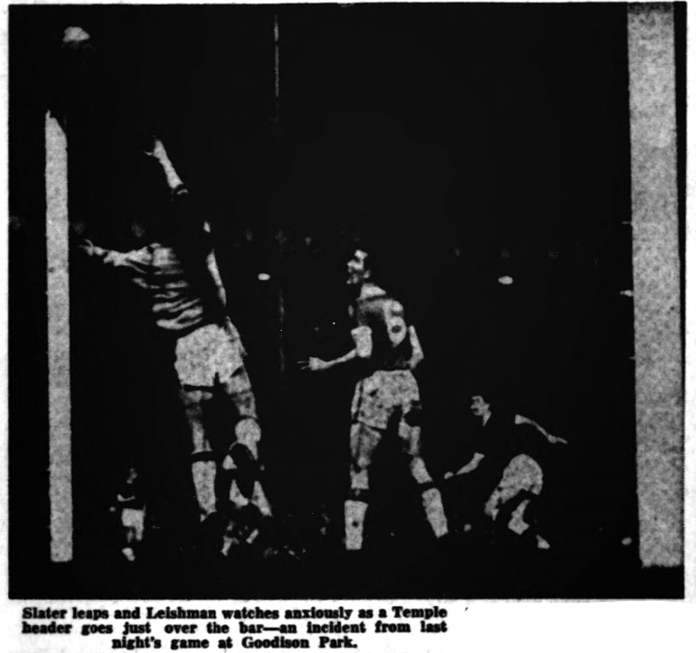 Everton were given a hard fight by a Leeds side which was inferior only in finishing. Despite many brilliant saves by Carling, Everton had sufficient chances to make sure of victory in the first half-hour. Just when Everton seemed to have lost the initiative altogether centre forward Webber proved their match-winner. He scored a brilliant individual goal in the 56th minute and laid on the second for Temple eight minutes later. While goalkeeper Rankin performed impressively, Everton’s outstanding defender was right back Parnell who scarcely out a foot wrong, Mayers a former Everton player, netted for Leeds three minutes from the end.
