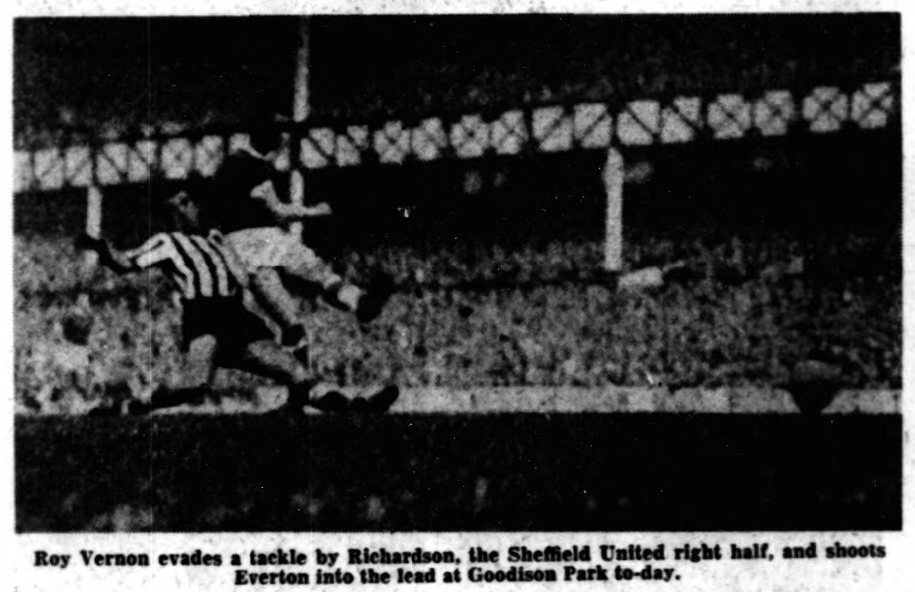 A minute after half-time brought the third goal and here I felt that Iley was unlucky in having a free kick given against him after a tussle with Collins. But the goal was a beauty, for Fell hooked Bingham’s kick back into the middle and Young made a header of such force and direction that Grummitt did not move as the ball rebounded from the net stanchion. Fell occasionally faltered because he ran into trouble, but there was nothing wrong with his goals in the 14th and 61st minute, his first in the League for the club. Young made the opening for his first with a lovely pass and the shot which ended it was worthy of the move. Fell’s second came when Young put Bingham through and Collins helped on the pass to a spot from where the left winger could hardly miss, while the last goal (76 minute) was scored by Vernon when Young raced through, chipped the ball over to Bingham who brilliantly headed it back to the scorer. Everton; Dunlop; Parker, Thomson; Gabriel, Labone, Harris; Bingham, Collins, Young, Vernon, Fell. Nottingham Forest; Grummitt; Baird, Grant; Whitefoot, McKinlay, Iley; Cobb, Booth, Julians, Quigley, Addison. Referee; Mr. R. Harper (Sheffield). Attendance 42,431.