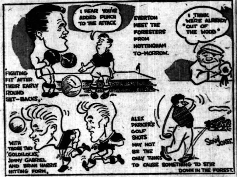 The money side of football to-day compared with the past is emphasized by the cutting I have received from Mr. J. Cadwallader, of Murrayfield Road,Liverpool 25. It is an ancient one, dated 1911:- The Wolves' directors have long been criticizedfor holding fast to their bank balance instead of speculating in new players. By the acquisition of Young, of Everton, for £800, the one admittedly weak spot in the team has to been strengthened. The amount of the transfer fee created a big surprise." It’s a far cry from £800for a player of Sandy Young's stature to the £8,000 odd Liverpool took from the Newcastle United match for the attendance of some 52,000 spectators. hat figure may well be approached, or even bettered, at Goodison Park to-morrow when very good Nottingham Forest team come here to tackle the Everton everyone hopes are going to take a further step in rehabillating themselves after many injuries. Forest, now in the charge of that forthright and most honest of men. Andy Beattie, had a pretty lean spell immediately after their Wembley final. The size of Everton's task is well known by Manager Harry Catterick who has illusions about the strength of Forest’s play. It will be good to see Collins and Vernon inspiring the Everton attack again. They did well enough against Arsenal, now they are match-fit they should be even better.