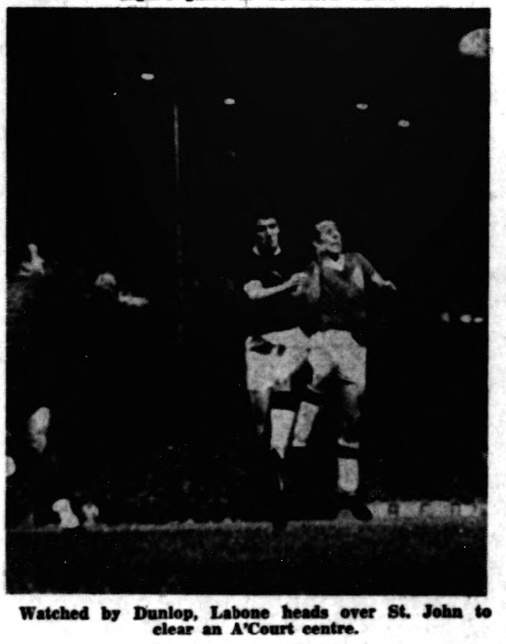 I think this Everton team has reached the stage at which they can only make progress providing they have seen the last of injuries for a while. The long looked for soccer treat is at hand. Most unlike Parker he gave a goal away. He was probably the only man on the ground who did not see Charles take advantage of the mis-kick to send his crashing through Dunlop’s guard into the net for a score (37 minutes) which equalized Vernon’s goal after nine minutes laid on by Gabriel and Young. Parker held his head in his hands on the turf as though afraid to look up but it may have been that he was injured, for a few minutes later he collapsed and had to receive attention. It was a glaring error, but if any man could by subsequent effort, atone for his crime, Parker surely did. I make no apologies for being a Parker admirer. There is a crispness and cleanness about his tackles an intelligent reading of every move that to my mind puts Parker on a full back pedestal too lofty for most rivals to climb. Quietly and undramatically George Thomson had advanced too. He is a one hundred per cent superior now compared with the halting player he was against Arsenal in his first match last season, and his first time tackling, delivered with all the determination at his command, is reducing many of his opponents to hesitancy and consequent impotence. Labone strode through the game calmly, resolutely and impressively and no-one could quarrel with Dunlop, for whom we may hope, the worst is last.