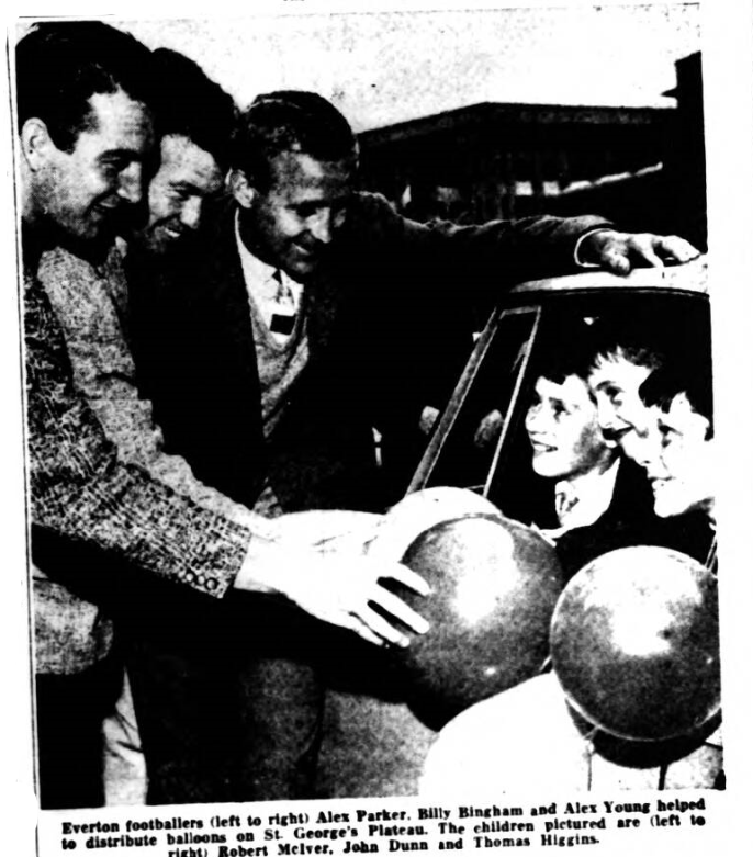 The Lord Mayor and Lady Major of Liverpool (Alderman and Mrs. John McMillan) gave a civic send-off to Liverpool motorists’ annual outing for physically handicapped children today. Everton footballers Billy Bingham, Alex Parker and Alex Young were among the large crowd on St. George’s Plateux to see the children leave for Southport.