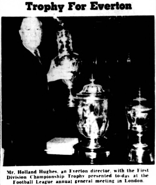 The League Championship trophy won by Everton may make one trip for display in town before it is put in the place of honour in the club’s trophy cabinet. There is no further news of the possibility of a Civic reception for the team. Manager Catterick says there have been many demands for the club to display the trophy in and around Merseyside, but that of they agreed all requests the thing would never be in its proper place at Goodison Park. The Huyton reader who pointed out, innocently or otherwise, how long it was since Everton last won a major trophy or appeared in the final at Wembley, has his answer from the equally deep-dyed M. McKenzie, of 94 Crosswood Crescent, Huyton-Roby. He writes;-