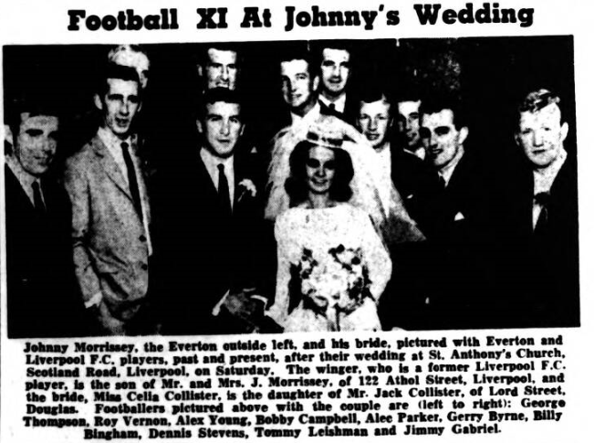 Members of Everton’s championship winning team watched this afternoon as their team mate, outside left Johnny Morrissey, signed on in a new role- as a husband. They were guests at the wedding at St. Anthony’s Church, Scotland Road, of Mr. Morrissey and Miss Celia Collister, of Lord Street, Douglas, isle of Man. Mr. Morrissey, who is 23, is the son of Mr. and Mrs J. Morrissey, of 122 Athol Street, Liverpool. A former England schoolboy international, he played for Liverpool before signing for Everton at a fee of 15,000 pounds at the beginning of their championship season. He met his bride, who is 22, while holidaying in Douglas six years ago. She is the daughter of Mr. Jack Collister, of Lord Street, Douglas. Miss Collister was attended as bridesmaid by her sister, Miss Betty Collister, and the bridegroom’s cousin, Angela Harding was the child attendant. The best man was the bridegroom’s brother-in-law, Mr. Frederick Stanley. After the wedding, about 80 guests were entertained at the Lord Nelson Hotel. The month’s honeymoon will be spent in Majorca.