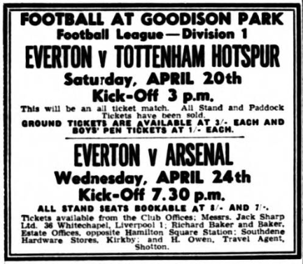 From Anfield and their preparation we switch to Goodison Park and Everton's home game with Arsenal this evening (kick-off 7.30). Only injury could have persuaded manager Harry Catterick to have considered any sort of team changes and happily everybody is perfectly fit. With the Tottenham match behind them, convincingly won, any sort of tension that might have crept in should have been eliminated and I look to the prospective champions to atone adequately for the costly slips that were made at Highbury a few weeks ago. Some of Everton's football in this match was top class but they paid dearly for their mistakes. The form against Spurs should be more than adequate to cope with the Londoners. I cannot see either Strong or Eastham being given the latitude enjoyed at Highbury. The menace of winger MacLeod is well known. He is the real danger, but I should think plans have been made to offset this, without the need for Gabriel and Kay to devote as much attention to other players responsibilities. Just now Everton occupy leading place on goal average only. What thrill and progress there will be if after to-night's match Everton are two point's out in front of Leicester, from only the same number of games. Everton –the chance is yours. Don't dare let us down! Everton; West; Parker, Meagan; Gabriel, Labone, Kay; Scott, Stevens, Young, Vernon, Morrissey.
