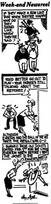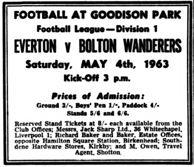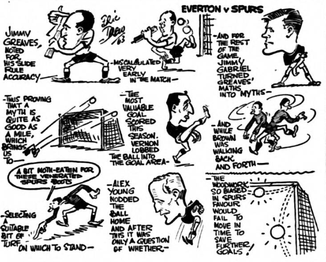 These were West Ham's only potent scoring attempts because earlier when the occasional shooting chance presented itself the finishing was wild and if Meagan had not been so unfortunate they would never have scored. This was due to the grip Everton took and I thought Parker did well against Brabrook, West Ham's biggest danger. He learned that Brabrook could beat him for speed and made the winger come to him, so that usually Brabrook tied himself in knots. Labone put Byrne under his thumb completely and the result all through was that Everton looked –and played- like champions. They all get credit for this. Everton's first goal came in 32 minutes when Kay found Young in the centre with a chipped pass. Young glided it downwards to Vernon, who controlled the ball beautifully before beating Standen with a shot to the bottom corner. Just before half-time Kay again gave Young the pass and this time the centre-forward took Brown and Burkett out of the way before back-heeling in front of the incoming Scott. The shot was hard and low so that Standen could not hold it and in nipped Temple to score. West Ham had no forwards to equal the skill which produced these goals and their best players were the half-backs with Brabrook occasionally blossoming. Ace American golfer Walter Hagan, once stepped on to the tee in an open championship and said; "I wonder who is going to be second?" No-one at Everton is likely to say that at present, but I feel that way about their championship prospects now. West Ham; Standen; Kirkup, Burkett; Peters, brown, Moore; Sealey, Boyce, Byrne, Hurst, Brabrook. Everton; Dunlop; Parker, Meagan; Gabriel, Labone, Kay; Scott, Stevens, Young, Vernon, Temple. Referee; Mr. N.A Matthews (Bicester). Attendance 28,461.