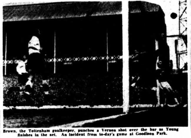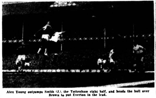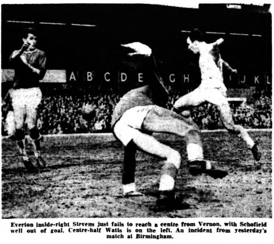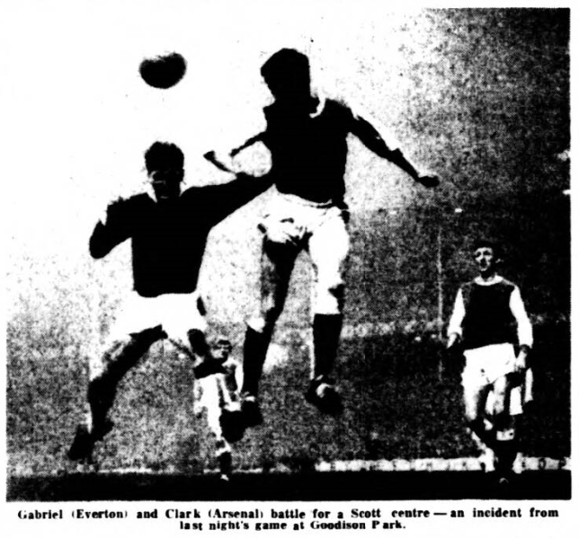 Vernon had started out in most impressive fashion. This looked as though it was going to become one of his old time special performances. He had hard lines when he lobbed the ball over. McClelland and cleared the cross bar as well, but when his one great opportunity came to spike the Arsenal guns, he failed. There were only twelve minutes left and Everton were hardly earning any sort of sight of the Arsenal goal. Then as defence was concentrated more and more infield Everton sought to bring Scott, for so long neglected into the game. He found Vernon expected with an accurate pass, right in front of goal. By way of a change Vernon had been given as unexpected breathing space, and in trying to pull the ball clear of McClelland beyond any hope of recovery, he dragged it outside the post as well. This was the last real opportunity to come Everton's way, although five minutes earlier Scott had again dominated the scene with a run and shot which was heading for goal, when Brown kicked clear only a yard or so from the goal line. Everton do themselves a disservice when they forsake their normal style of football for less rewarding ideas, no matter how great the temptation. They must learn that constructive endeavour is their strength and go all out to play football all the time, even when opponents tempt them to do otherwise. Everton; West; Parker, Meagan; Gabriel, Labone, Kay; Scott, Stevens, Young, Vernon, Morrissey. Arsenal; McClelland; Magill, Clarke; Barnwell, Brown, McCullough; McLeod, Strong, Baker, Eastham, Skirton. Referee; Mr. L.Y Tirebuck (Halifax). Attendance; 56,034.