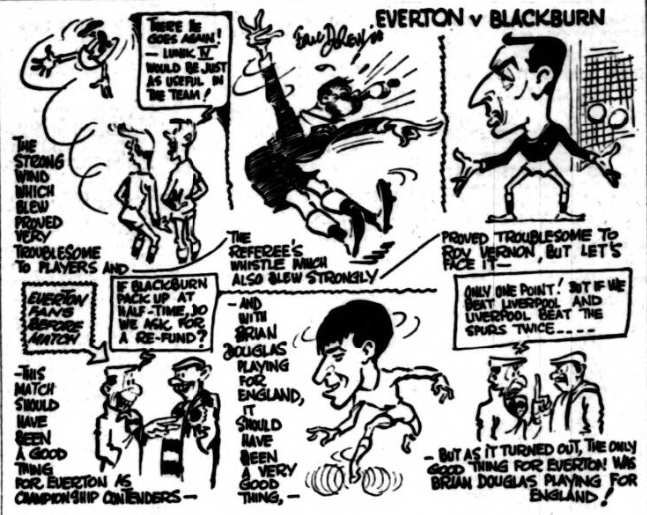 The two points Everton earned at Villa Park on Monday were like a tonic after a nervous breakdown. None of us needed any reminding just how import this match was, neither did we require that time was no longer on our side and that the dangerous slide which had developed had to be halted if we were not to squander all the work we have put in during the season. At the risk of being wrong I take liberty to prophesy that this could mark the turn in our fortunes and that from now on starting with the home game with Blackburn Rovers tomorrow. Tottenham will know that Everton are still very much in the League title race. I am glad of the selection of my friend Bryan Douglas of Blackburn, for international honours for two reasons. Firstly because I believe he is entitled to another international cap, and secondly because he will be at Wembley he cannot be at Goodison to oppose Everton. Without Douglas, I think Blackburn are like chips without fish! We have an old score to settle with Rovers my old club, for they interrupted our run when we were at their ground, through the medium of a last-minute penalty kick. That is one reason, but more important still – we need the points!