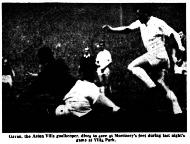 Villa were moving well at this stage with Woosnam spreading the ball about intelligently and George Thomson giving the lively Baker far too much room on the right. Baker's series of centres had Labone worried and there were several goalmouth scrambles with Everton's defence at full pressure, but on the half hour Villa had a let off when Morrissey lobbed the ball over Gavan but Crowe managed with an acrobatic double clearance to save on the line. Just before half-time Labone failed again, to allow Burrow's a clear run to goal, and Labone pulled the winger back by clutching at his shirt. This was the signal for a burst of slow handclapping and feet stamping by the crowd against Labone and this was repeated at the end when the teams left – no doubt they had still remembered the Burrows incident. Everton restarted brilliantly and from a great left wing move Young beat Gavan with a fine header from Morrissey's centre. Young made another good header a moment or so later which Gavan saved and then produced a superb bit of artistry by the corner flag before sending the ball across goal where Morrissey missed a glorious chance by shooting over.
