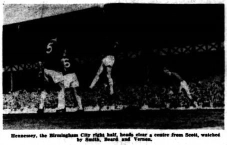 The pace was tremendous and Arsenal's chivvying and chasing of Everton men in possession always a great embarrassment, but Everton continued to create chances. Scott, Vernon (with hard hit shot and lob) and Stevens and Kay all had first-half chances but the score at the interval was 1-1. McClelland, a good and quick goalkeeper got his body in the way of a shot a third time early in the second half, this time after Stevens had picked up his punch away, and Scott's shot was turned for a corner, almost on the line by Brown, but Everton seemed to fizzle out from this point. Kay's wonderful defensive finesses, which the crowd appreciated fully were later spoiled by over-fierce tackling (some of which did not connect) which caused even home spectators to gasp…