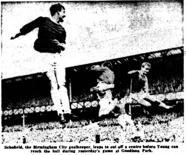 Young's artistry is the delight of the Goodison crowd. He doesn't show it often away from home. Last night, however, he gave a display of genius and ran young Sleeuwenhook ragged. He beat him in the air, never failed to beat him on the ground, and had the appreciative Villa crowd applauding loudly at some of his exquisite touches. He scored a goal, made numerous openings for others, missed just one chance and could have had a hat-trick but for brilliant saves by Villa goalkeeper Gavan, playing only his second League game. With Stevens also having a fine game, and Morrissey excellent on the wing the attack moved with skill and often brilliant approach work. Only Scott did not attain the level of the others, for full back Aitken had a first class game and kept the winger subdued. Behind them Kay and Gabriel were in top form, moving through a hard match with precision work of a high order. We have come to expect this level of performance from them, and they are undoubtedly the backbone of the team, rarely failing to give their all. For example, Kay took a heavy tumble in the second half and was helped off with blood streaming from a cut over his left eye. He was back within a couple of minutes, his white shirt stained with blood, and played on to the end as though nothing had happened. He had three stitches inserted in the cut afterwards.