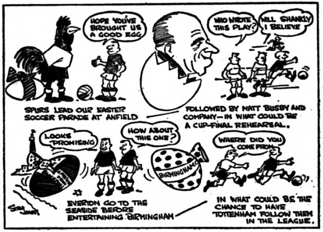 In expressing the hope that we are about to start on a new run of successes I realize that on Monday we have to travel to Anfield and I would only be dodging the issue if I did not admit straight away that this is regarded as the most difficult of our remaining fixtures. Who will win? Who can say? Liverpool are playing better now than they were when last we met, but these "derby" games have a habit of bringing out the best in us, and all I will forecast is that it will be a terrific game, with the only disappointed people being those who were unable to get a ticket. There is so little between us, these days that whichever side has that little bit of luck, could find it deciding the issue, I think it is our turn to have that this time round. Tottenham will be watching this game with even more interest than they did that at Highbury when Arsenal did them a good turn by beating us. This will be the first experience of a Merseyside "derby" at Anfield for Tony Kay, Alex Scott and Gordon West, but Gordon has played against Liverpool at Goodison and I don't suppose these matches are very much different to Tony than the Sheffield in which he has figured so often or the Glasgow battles with which Alex is so familiar. I don't think the game will be any different from the rest in that the first goal, whichever side gets it, may be very important. I would like to wish the Liverpool boys the best of luck in the international match at Wembley and assure them that no matter what may happen there, we will help to give them a warm reception on Monday. At the same time, I would also like to add that I hope this will not be their last view of Wembley this season.