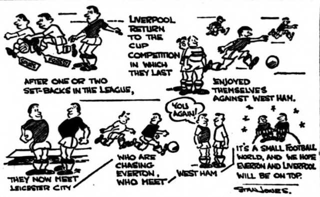 Everton have their own Cup battle today. Not the glamorous F.A Competition but the lengthier and more exhausting League Championship trophy- and a visit to West Ham their fifth round F.A Cup conquerors – is a tough enough task for any team. Every point is precious. It would repair a few shattered hopes if Everton were to return from Upton Park with two points as compensation for that dropped on Wednesday against Arsenal at Goodison Park. There has been time enough to allow any bitterness and acrimony which may have been left by the last meeting in London to evaporate, and I expect to hear that the this game has been played in a keen but sporting spirit.