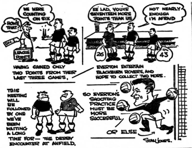 Everton return to Goodison Park after three successive away games, the last of which, at Villa, went far towards rehabilitating them in the eyes of rather disappointed supporters. I heard of one man who was prepared last week to offer 25-1 against Everton winning the championship this season. The alacrity with which he was taken up caused him to change his mind quickly . . . I would say the odds were more in keeping with Liverpool's chances. Following their Villa win and the emergence of Young is his best form; Everton's League chances are undeniable. We shall know more about them when they have played Blackburn Rovers (minus Douglas) to-morrow and Liverpool, at Anfield, on Monday night. The first Derby game this season produced a draw. It could be that Monday's match might be the shape of a fixture to come—Cup holders v. League champions! Blackburn, without Douglas, are much less to be feared. They are a workmanlike side, but not an inspiring one. If Everton can recapture their pre-Ice Age inspiration they should win readily, but if Else, a goalkeeper who has just found his best form plays as well to-morrow as he did in mid-week against Burnley (he almost held them single-handed) they will have a hard time beating him. Matt Woods. War horse supreme and still one of the daintiest and fairest of centre half-backs, comes back to his old club on a second lease of football life. What a good buy he was when he left Goodison for Ewood in the Cliff Britton era! The Blackburn half-back line, with England, of Wales. on the left, and Clayton, formerly of England, on the right looks as though it could make life difficult for Everton forwards who have not played well as a line, for some weeks, until they sparkled at Villa.