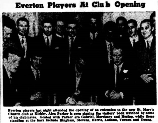 Heading tennis, of course is not new to us, but badminton and cricket are. At badminton the bigger players, particularly Gordon West and Jimmy Gabriel seem to do well, while when it comes to cricket- played with a soft ball, bowled under arm- the spin of Brian Harris is often unplayable. Another change is routine this week was a visit to the Corporation Russian Baths, at Picton Road on Wednesday. This is something, I thoroughly recommend for a frosty morning, but several of the boys were quick to advise Roy Vernon that they did not think he should visit the premises too often. These outings make a pleasant change, but I don’t think there is a man at Goodison who is not itching for a return of the weekly League and Cup routine. We are not terribly disturbed by the fact that Spurs knocked us off the top of the table by beating Blackpool but I support the theory that points in hand are better than games in hand, so would not like to see Everton dropping too far behind on this score. The entire Everton first team had an outing on Monday evening but it was only a social visit to Kirkby, where along with several of our reserves, we opened an extension to the social club at St. Mary’s Church. Led by their parish, priest Father Spain, the numbers gave us a rousing welcome and we were all very impressed by the hospitality shown us.