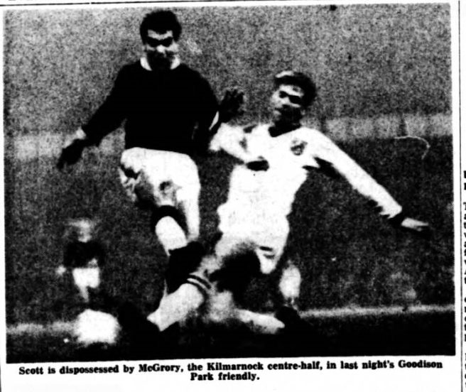 For their friendly game with Scottish League club Kilmarnock at Goodison Park this evening (kick-off 7.30 p.m) Everton introduce £40,000 signing from Glasgow Rangers, Alex Scott at outside right in place of Derek Temple. Although Scott has yet to make his home League debut, it will be his second appearance at Goodison for in 1958 he played with the Scottish Under-23 team alongside Parker and Young against England Under-23 side. He also appeared in the Everton side at Leicester on February 12. Everton; West; Parker, Meagan; Gabriel, Labone, Kay; Scott, Stevens, Young, Vernon, Morrissey.