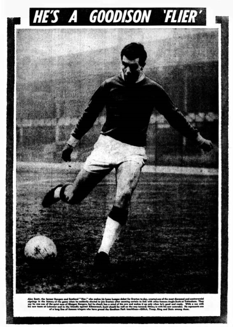 Alex Scott was a happy man last night after his memorable Goodison Park debut in which he scored two goals. Scott, given an ovation as he left the pitch, said later, “I was very pleased with the way things went for me. It was great to be in action again- and on a soft ground.” “The corner kick was just one of those things-a bit fortunate really, but it went in the net and that was all I was worrying about,” said the “twenty-five-years-old Scottish international winger. “The fans,” he added were very good, just as enthusiastic as those at Ibrox, but not so critical. I hope they were pleased.” Goodison is a fine ground and it’s a treat to play there –more so since the surface was nice and soft after all the ice we’ve had these last couple of months. “Yes you can say it was quite a night all round.” Sharing Scott’s happiness were most of the 24,000 Everton supporters at last night’s game. “He’s just what the doctor ordered- with the speed he’s got Liverpool won’t see which way he’s going, said one of them.
