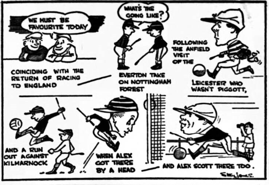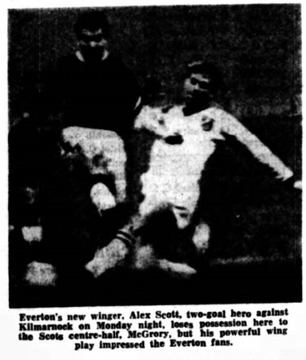 Alex Scott, Everton’s new Scottish international right winger, made a fine home debut at Goodison Park last night when he scored two goals- one direct from a corner-in the friendly against Scottish First Division club Kilmarnock. Everton had to fight tremendously hard to beat the Scottish club. The intention was to provide both teams with match practice and the plan certainly worked out for it was a stirring struggle in which both sides gave everything they had. With both team ignoring a purely defensive game there was plenty of excitement for the crowd and their biggest disappointment must have been the way Everton fell off in the second half after leading by two goals at the interval. Everton’s big failing again was in attack. Although they had more of the play in the first half their shooting was not good and Kilmarnock could only blame their own poor finishing for not getting more out of the match than they did. A good proportion of the crowd no doubt came to see Scott make his home debut. Scott suffered from a poor service of the ball and had a very quite match although it was remarkable that he had a direct part to play in Everton’s first three goals.