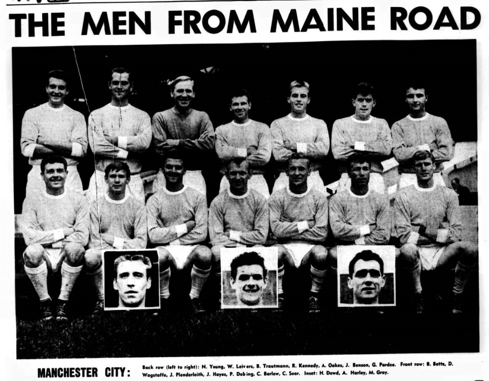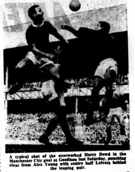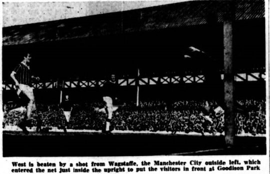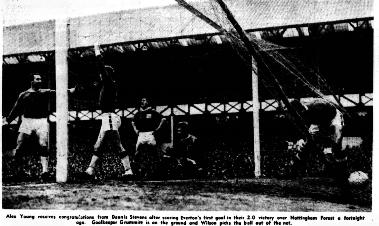 What a picture goal was Young’s! It had its inception in just another throw-I, whose purpose for the most part is merely to bring the ball back into play, but this time there was genuine intent from the moment Gabriel put the ball at Vernon’s feet. With what was probably the most accurate pass of the entire match, Vernon placed the ball superbly to the head of Young and the ball was in the net. Those for whom the sight of Vernon lashing home one of his power drivers is still a favourite Goodison spectacle, may be dismayed at the lack of explosive charge these days, but his precisions passing and placing lost glitter only because the final tribute was denied them. Everton; West; Parker, Thomson; Gabriel, Labone, Kay; Scott, Stevens, Young, Vernon, Morrissey. Manchester City; Dowd; Betts, Kennedy; Benson, Leivers, Oakes, Young, Dobing, Harley, Gray, Wagstaff. Referee; Mr. E.T. Jennings (Tourbridge). Attendance 46,101.