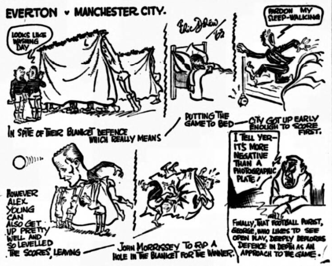 Happily worst fears were not realized, for Betts escaped from his duel with Young, with nothing worse than a badly brushed right ankle. Betts had succeeded in keeping the energetic thrust of Morrissey fairly well in check, but as seen as Benson took over the shadowing duties the Everton winger emerged as the most dangerous of the Everton attack. Beating his man at will, he was a menace whenever in possession, and although Leivers headed out a shot from Morrissey the ball’s rebound promptly presented the winger with a second shooting chance. This time, Morrissey shot hard and true to the bottom corner of goal (60 minutes) and one felt that no matter how remiss the Everton attack might be for the rest of the game, sufficient damage had been done to sink City’s hopes. For twenty minutes of the second half it was almost as though the pitch ended at the half way line, for City had scarcely set a foot in Everton territory and yet from one of their tip and run affairs, only a great save at full stretch by West prevented a long dropping shot from Oakes, from restoring equality. A draw would have been a triumph for City’s ten – men courage, but it would have represented stark tragedy for Everton, who had made so much of the game appear like a practice session, with the accent on the testing of goalkeeper reactions. Because City’s defensive reputation had gone before them, I believe most people were pleasantly surprised at the provision of an exhibition, full of attractive movement and skilful football. To their credit City, apart from the pardonable stratagem of using Wagstaffe as an extra brake on Scott operated with four forwards up, until the injury to Betts vindicated a tactical switch. In any event Everton demonstrated that the answer to all-out defence is all-out attack, especially against a side not sufficiently gifted in speed to strike devastatingly on the rebound. So beautifully did City take the opening goal through Wagstaff in 16 minutes that the thoughts of those who have dictated less courageous and attractive tactics for them in the past, must have been stimulated, for remember the goal was taken against the most successful defence in the country! Despite his other responsibilities Wagstaffe was perfectly placed to run on to an intelligently placed pass from Dobing and his shot was a winner all the way. “Now watch for the 2-5-3 monstrosity,” some foil said, but City proved them wrong. They kept the game open and while they were nothing like the masters of their craft that Everton were a response by Alex Young in 23 minutes was all the home team could offer before Betts’ retirement.