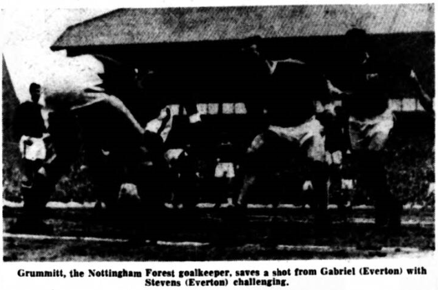 West was able to make a comfortable save from a header by pace and the game had become so centred in midfield now that the goal incidents were rare indeed. West did, however, make a splendid save after he had come out of goal to block a centre by Hodgson, the ball rebounding to Pace, who cleverly chipped it towards the empty net. But West recovered and somehow managed to punch the ball over the bar with Wagstaff coming in at the last second. Everton’s defence was playing very soundly with the half backs particularly good. United moved the ball about so well at times, with their own wing halves linking up with the attack, that it needed some first-class tackling b Everton to keep them out. Everton at last produced a good move with the ball coming from Thomson, deep in defence, initially. When Morrissey got it he made ground and centred well, but Joe Shaw, who headed the ball down coolly, then completed the clearance. This had been a first half in which defences in the main had been in control, Everton’s defence had been the busier, but West had only once or twice been in real difficulty. Half-time; Sheffield U nil, Everton nil. Immediately on the resumption Vernon broke away down the middle but when the ball was switched to the wings Graham Shaw cleverly dispossessed Scott. United broke away with Hodgson getting across his centre despite the close attentions of Gabriel, then the ball came out to Allchurch, who shot straight as West. Joe Shaw, who had played superbly made his first mistake when Vernon dispossessed him and took the ball on to try an angled shot which Graham Shaw turned away for a corner. From this, Vernon got the ball across to Scott whose shot, from 18 yards, flew over the angle of crossbar and upright. Graham Shaw cleverly intercepted Scott’s pass and took the ball up to Everton’s penalty area before slipping it to Hodgson, who once more shot directly at West. United’s poor finishing was disappointing the crowd. They made many more openings than Everton, but their shooting was very poor.