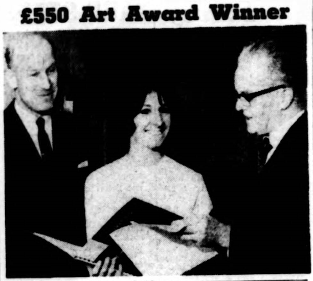Miss Valerie Allam, of 18, Globe Street, Liverpool, photographed yesterday after being told that she had won a travelling scholarship worth £550 for the winning entry in a competition in graphic design open to students of the Liverpool College, of Art. The prize is awarded annually by Mr. John Moores (right). Also in the picture is Mr. J. W. Norman, Principal of the College. Miss Allam, aged 21, will now realise an ambition to tour the Continent and learn more about the subject she has chosen for her career - design typography. She is a former pupil of Blackburne House High School for Girls and won the prize with a display of general typography.