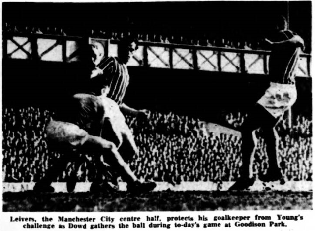 I confess that I did not go a bundle on the Everton performance, nor on the work of Mr. E. T. Jennings, of Stourbridge. He gave some decisions which seemed doubtful—which referee doesn't?—but, worse, he allowed, in a quiet way, many tackles which should not have been overlooked. Manchester City dissented against some and I don't wonder. For the depleted City defence, faced by wave after wave of Everton fury, this must have been the most grueling game of the season. In the end Dobing appeared to me to have lost interest in the game. It was left to a brave, but outnumbered defence, to confine the margin to a goal. Their defensive tactics after a more orthodox beginning had produced the lead for them were incomprehensible. Even when they were 2-1 down with 10 minutes to go City seemed content to remain in their own penalty area. The one-sidedness of the match once Betts left the field, damaged in a tackle made by the Everton centre-forward, Young, had to be seen to be properly appreciated. The only thing which saved the game and made it acceptable was the intensity and persistence of Everton's attack (never can five men have had so many acceptable passes slid to them) and the intensity and persistence of the defence which faced them. No matter how hard Everton shot, or how unexpectedly. Dowd got his hands or feet or body to the ball. He was beaten earlier only when the defence appeared to stop playing and allowed Young to head home Gabriel's long pass from the left-half position and when Morrissey, having had one shot headed out, picked the ball up on the rebound and hammered it home in a way which gave the goalkeeper little or no chance. Wagstaffe. City's best , (perhaps their only) forward, had jolted Everton and the crowd by giving his side the lead with a cross shot West might well time reached.
