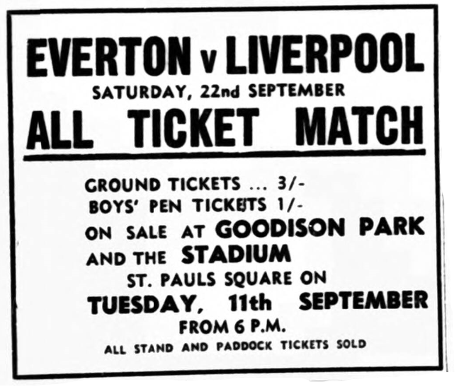 Everton have decided to make their match against Liverpool, at Goodison Park on September 22, an all-ticket game. Tickets for the ground and boys' pen will be on sale a week to-morrow at the ground and also at Liverpool Stadium Tickets will only be sold on this day to personal applicants only. All stand and paddock tickets were sold last week within a day of the club's announcement that they were available at the ground and Stadium. Interest In the "Derby" game has been unprecedented. It is the first League meeting between the clubs for 11 years and the ground record of just under 79,000 must be in danger of being beaten.