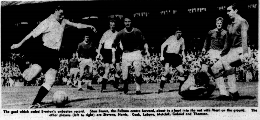 Young was scarcely seen; Vernon except in the final fifteen minutes, never played as we know he can't but there were some fine contributions from Gabriel (when he wasn't getting himself into limber); a typically clean and effective show by Labone and a first class demonstration of full back arts from Thomson. Harris, too, played well. Young had one good chance but put the ball straight at Macedo. Bingham had his moments, but when Macedo pushed him after losing possession was certainly not one, otherwise a penalty must have come. That Fulham should beat Everton when so weakened by injury is not really unsurprising, London grounds have been Everton's grand bogy for season. Everton; West; Parker, Thomson; Gabriel, Labone, Harris; Bingham, Stevens, Vernon, Young, Morrissey. Fulham; Macedo; Cohen, Langley; Mullery, Dodgin, Lowe; Legget, Cook, Brown, Henderson, Metchick. Referee; Mr. Tuck.
