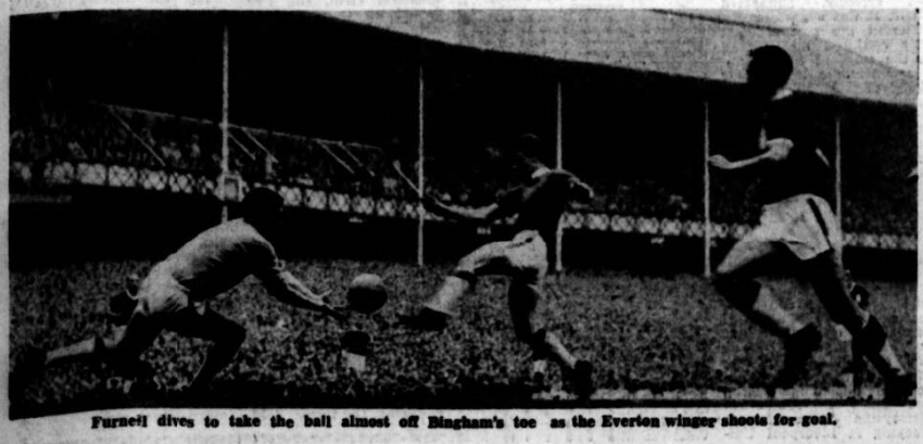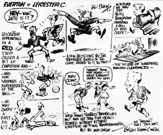 Bingham removed a painful memory when he was fouled by Lewis by flighting the free kick so well, Gabriel with an header, was able to make it 2-0 almost on the stroke of the interval. Robertson made a wonderful catch of a Bingham shot to show that the magic of the first half had not rubbed of in the interval. Lucas, one of two brilliant Wrexham born Leyton half-backs got away with a penalty push on Stevens. Young seizing his chance after Harris had been pushed to the ground in the "box" rammed home a shot and then found the score couldn't count. But Vernon's penalty did, so what matter." A Morrissey shot struck the bar. Young went near missing again by inches with a shot across the face of goal and a downward header which the bold brave Robertson pinned down literally on the line. A great save from a Gabriel header, another wood touching drive by Young- again the upright-and then a Vernon shot which came so quickly at the goalkeeper it was deflected by him, rather than deliberately put away for a corner. And a moment later, close to the end, Robertson completed what must rank as the finest game of his career with a final marvellous save from a glancing header by Vernon. In this game I pay tribute to Everton as a side. It would be unfair to individualise. They all had a great night. Leyton kept playing football and Dunmore, Lucas, Lea and Bishop and Robertson kept captivating it's by their efforts to pull the game round. They would have done immeasurably better if they had not had an outside left a player named McDonald who clearly though his mission was to beat Everton single handed. Johnny Carey remembered and respected was given a warm welcome by old admirers. Because his team is always obviously out to play the game and because their goalkeeper held out Everton single handed on so many occasions we shall be glad to welcome him, and them, again and again.