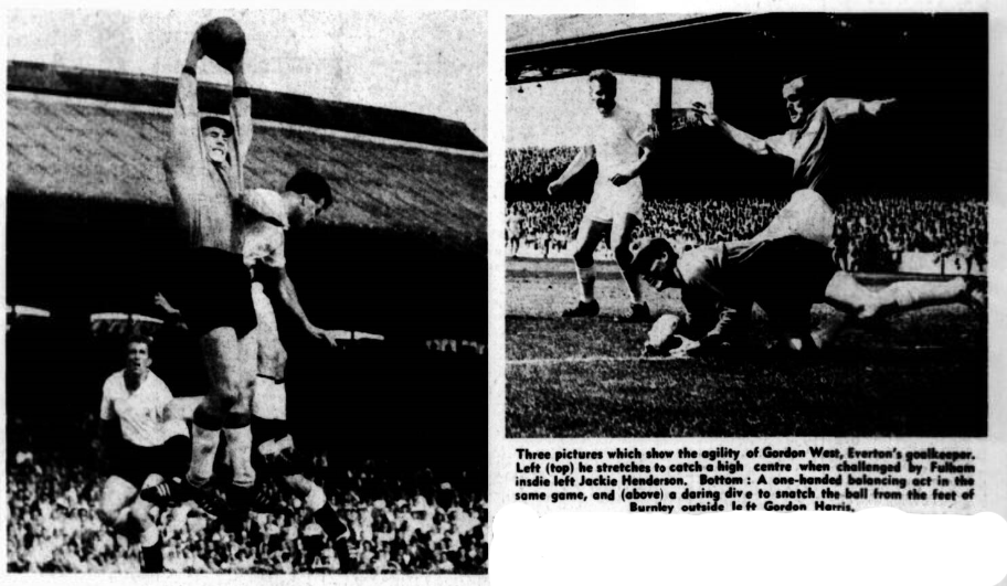 It was pretty scrappy football, relieved now by a glorious bit of work by Mullery and a judicious reverse pass to West by Gabriel after Metchick had crossed the ball from Mullery's pass. Neither side had really settled down so far. Gabriel and Metchick were now involved in an incident in front of the main stand and the referee, Langley and Bingham all had to pour oil on troubled water to claim things down. Everton were on top for the most part, but it had become a slow moving game with no special significance so far. Gabriel was being soundly booed when he went forward to make a left foot shot of great power and not far out-side the fart post. The third of Langley's big throw-ins proved fatal to the Everton defence. The ball landed not far from the six-yard line and was only half-cleared, so that Brown, moving to the right, was able to screw home the shot and put Fulham ahead at the 21stt minute. West missed Metchick's cross a moment later, but the ball was kicked clear ac Cook threatened to out on a second goal. The referee played the advantage rule when Vernon got away almost on his own a moment late, and the movement finished with Macedo having desperate difficulty to tip over the bar a lob from the Welshman.