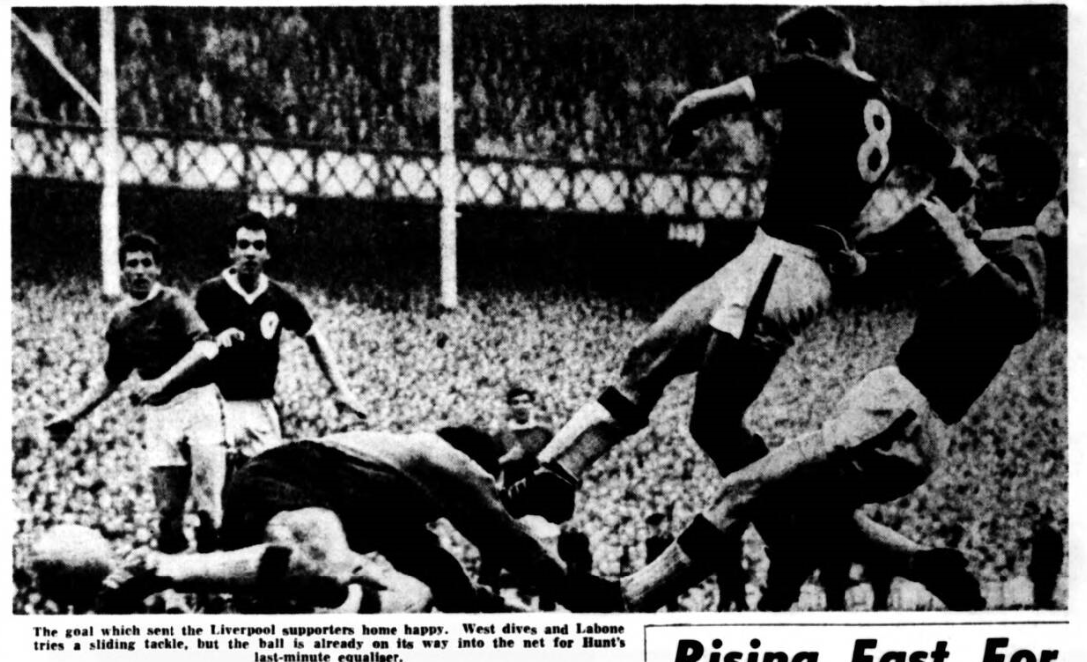 Unforgettable moments were many. The first-minute goal which wasn't, Yeats' telescopic leg reaching out to turn Bingham's header for a corner: Stevens' joy -cut-short score: Callaghan's acrobatic skill in keeping the ball in play and offering Lewis a chance which West denied him brilliantly: Vernon's cheeky penalty: Lewis great half volley from Callaghan's clever lob to make the scores level at the interval. Then afterwards, amid goalkeeping misfieldings, a shot by Morrissey over an empty net and an A'Court volley from Melia which brought down the house and all but bored a hole in West. A'Court hit the ball with all his power as he ran in. Even amid the din it sounded like the one o'clock gun. And the thud as the hall buried itself in the goalkeeper amidships a moment later was for the entire world like the sound re-echoing at Pier Head. How the goalkeeper clung to the ball and had enough wind and sense to get rid of it remains the great mystery of the 1962 Derby. Morrissey shot through the ruck to put Everton 2-1 ahead was yet another thing photographed on one's memory. So was the was the ball was hooked out from over the line to find its way miraculously to the arms of Furnell when he must have been standing at least 15 yards away from his sentry beat! After Young, Moran (free-kick) and Hunt had all made strikes, they changed the ball, but not Liverpool's luck. Purnell mishandled and Stevens missed a clinching chance: Vernon and Leishman were lectured. Furnell then saved two very awkward ones at the goal angle, one from Vernon's header (via Thomson) and the other from Thomson. Then with Liverpool seeming fated to lose A 'Court produced the centre from which Lewis made the downward nod for Hunt to slide in and beat West to it for a goal which tied the scores at 2-2 and drew the final ecstatic roar for the Liverpudlians.